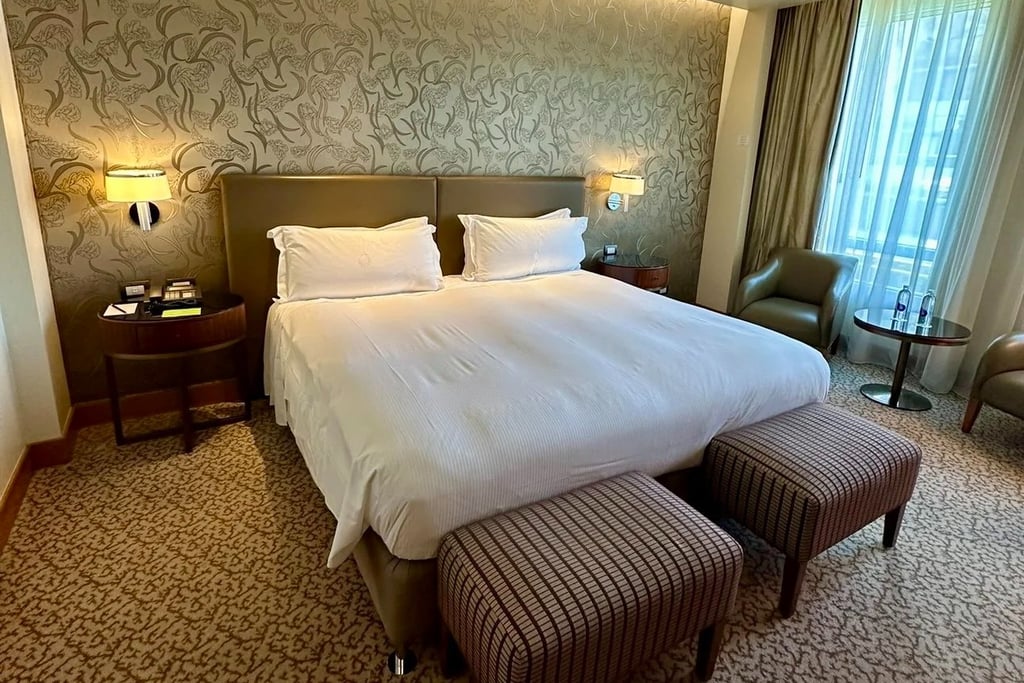 The design felt dated. The color palette, wallpaper, and furniture lacked warmth and didn’t feel particularly inviting. The room included two leather chairs, black-and-white city photos on the walls, a work desk, and a comfortable king-size bed. Practical touches like a Nespresso machine, minibar, safe, and flat-screen TV were all present.