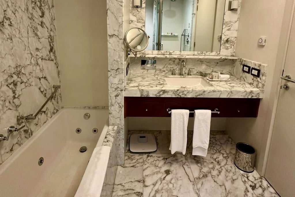The bathroom was finished in marble and included both a separate bathtub and walk-in shower. Despite the marble, the space still didn’t quite deliver the sense of luxury I expected from a hotel associated with the Alvear brand.